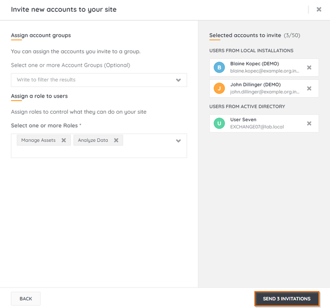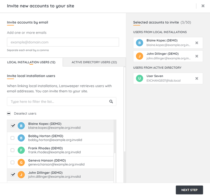 - Local installation users: invite local installation users detected by Lansweeper if their email address has been added.