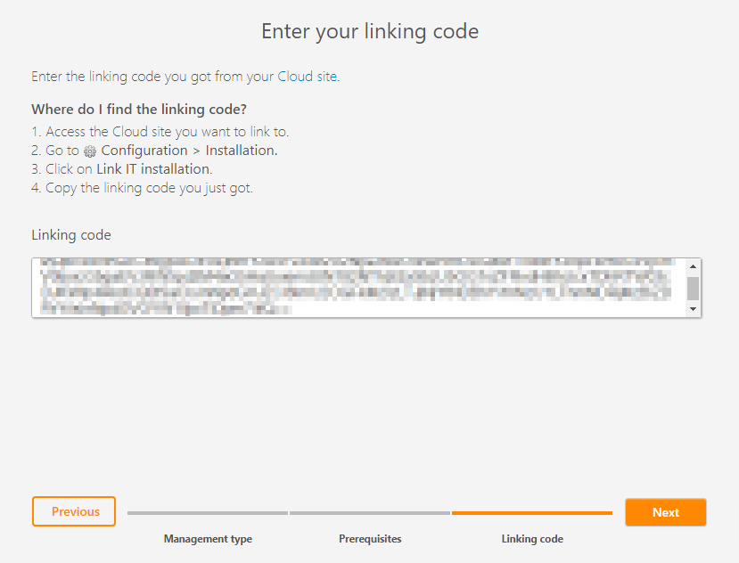 If you selected Access empty site instead, you can get your linking code from your site by going to Configuration > Installations > Link an installation.