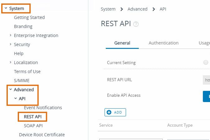 - Change the setting to Override, select Enabled for API access and a new service will appear called AirWatch API. The generated API Key will be used later to create the scanning credentials in Lansweeper.