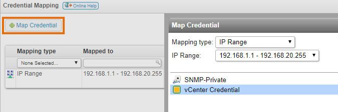 - If the credential you set up is not a global credential, map the credential to your vCenter server's IP address or IP range by clicking the Map Credential button on the same page.